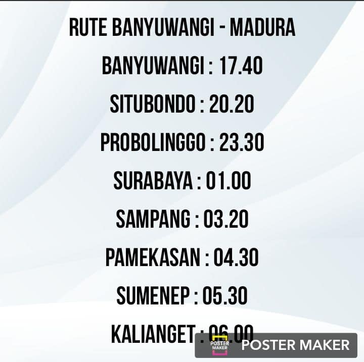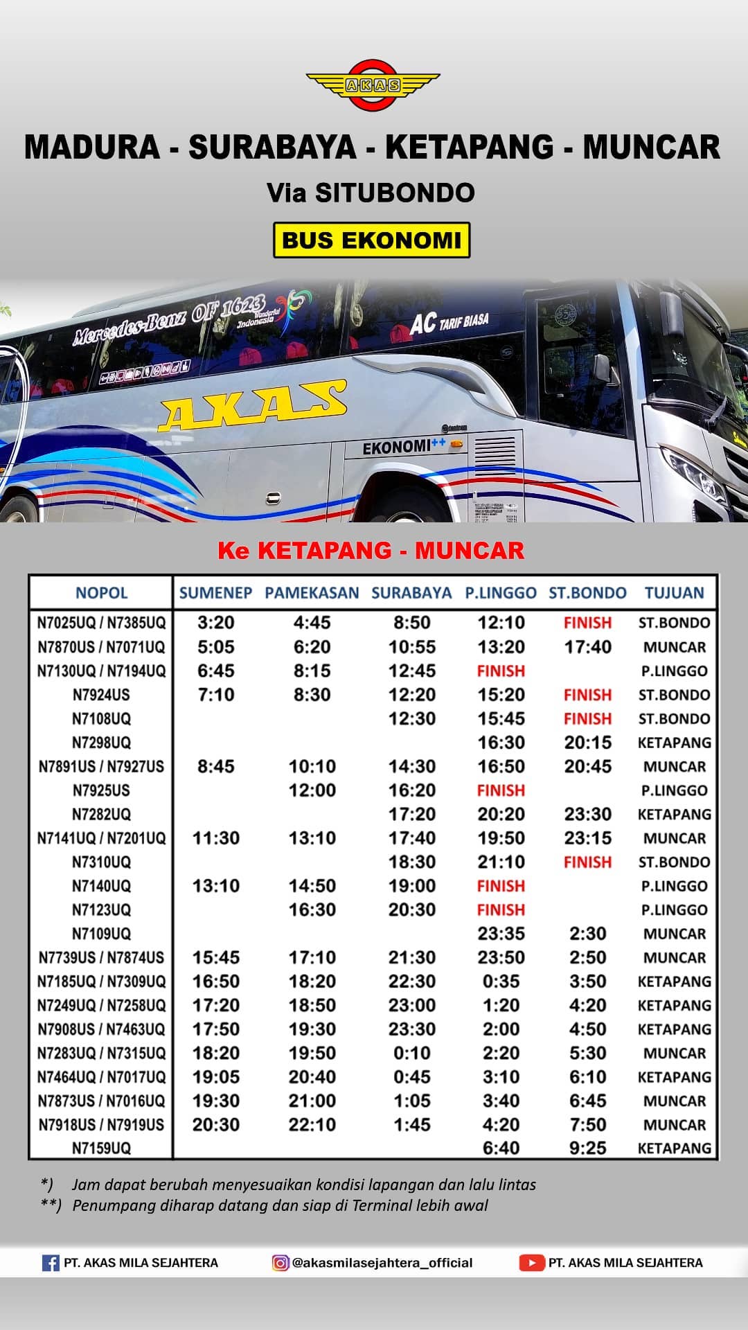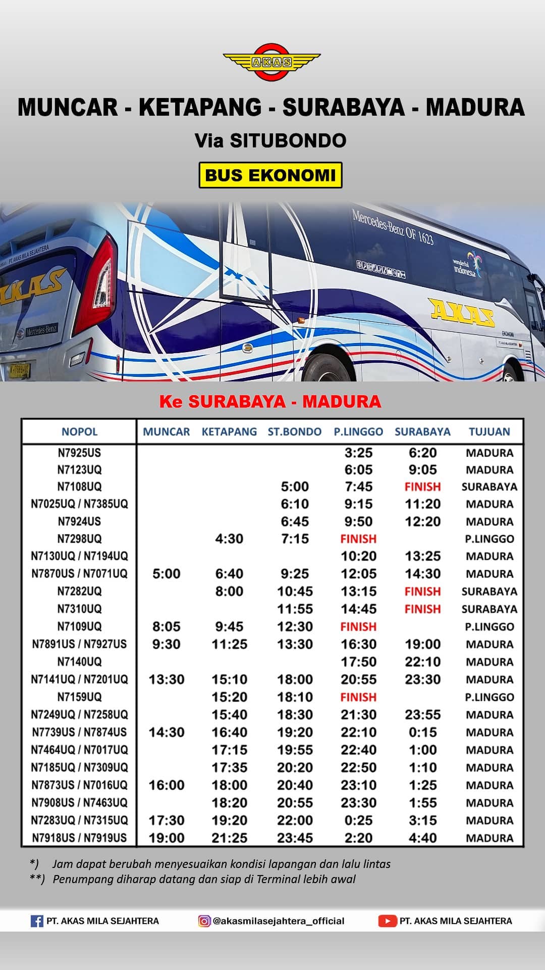 Bwi : 18.30 ,Jember : 22.45 ,Wonorejo : 00.00 ,Probolinggo : 01.00 ,Sby : 04.00